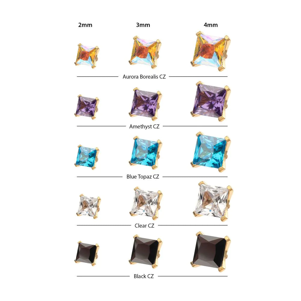 These tops feature a smooth, small, & flat base on the backside which transforms into a rounded smooth cup setting. The 4 prongs securely hold the square shaped gemstone in place while keeping it close to the skin. The mounting allows light to pass through the gem, enhancing its sparkle without protruding significantly from the piercing.