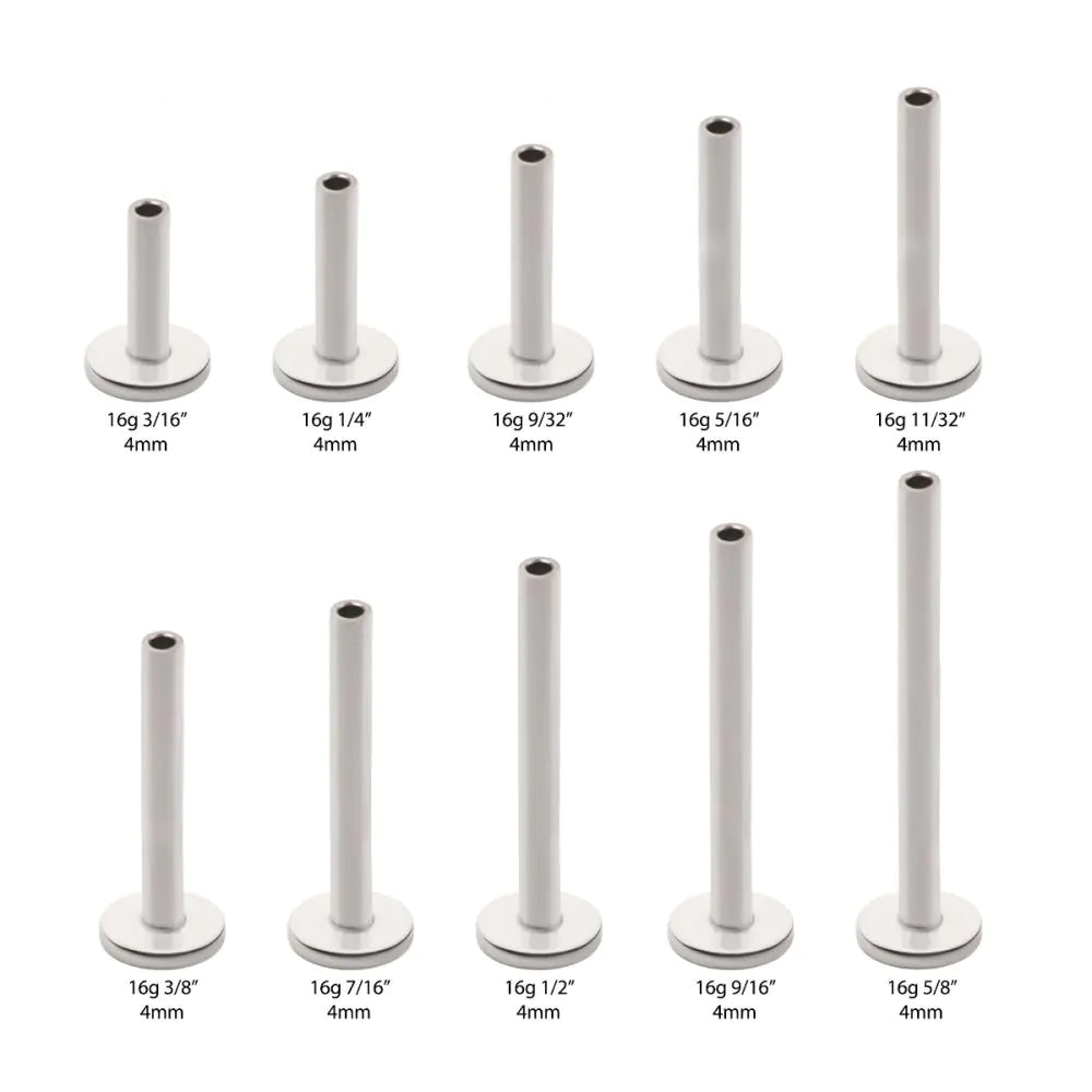 Our threadless titanium labret stem comes in multiple gauges and lengths, and is designed to accommodate any Invictus threadless top. Ideal for labrets, ears, and facial piercings. Manufactured from TI6AL4V ELI ASTM F-136 Titanium with a mirror finish polish.
